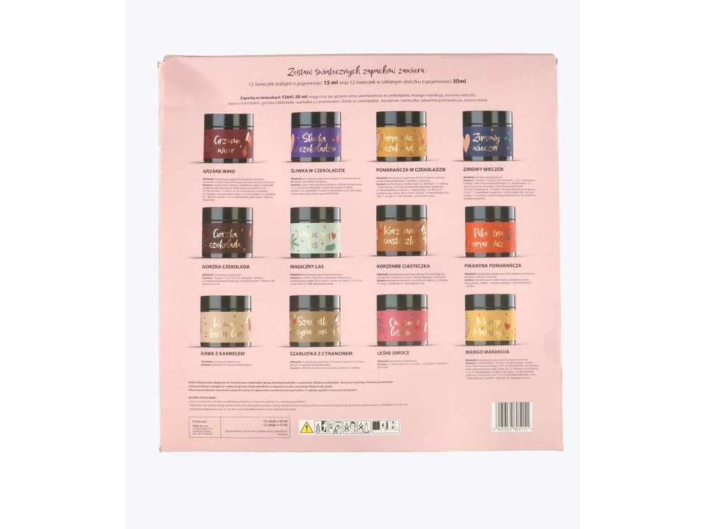 - Obsah: 24 sviečok (12 čajových sviečok 15 ml, 12 sviečok v sklenenej nádobke 30 ml)