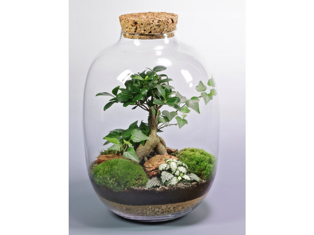 Biosféra v skle zložená z ficusu, brečtanu, machu a fitónie