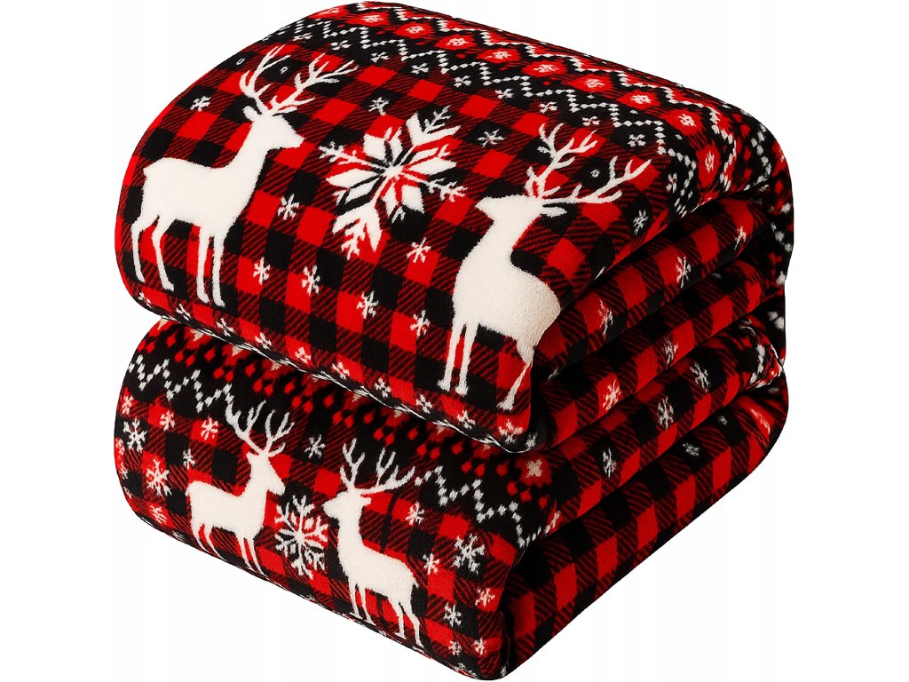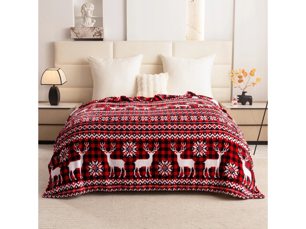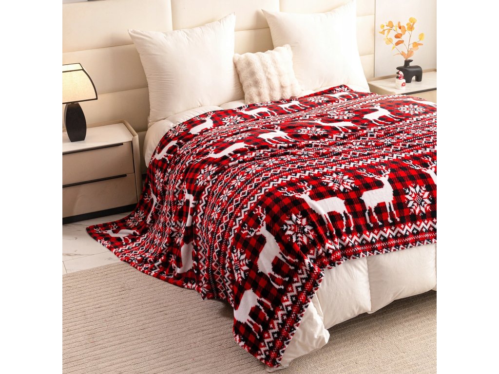 Červená vianočná deka z mikrovlákna so sobmi – teplo a sviatočná atmosféra pre váš domov